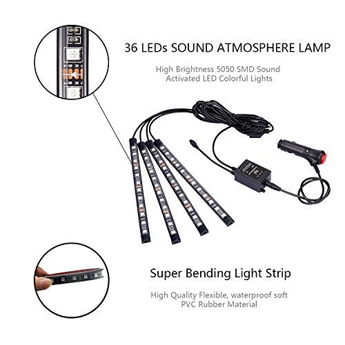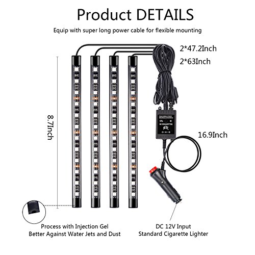 Interior Car Lights, Leadpo 4pcs Multicolor Interior RGB 48 LED DC 12V Light Strip Kit for Cars with Sound Active Function and Wireless Music Remote Control, Car Charger Included