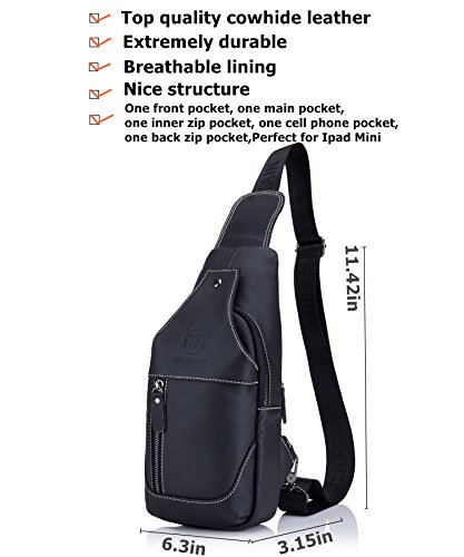 -. Feature : [Material /Fabric]: High quality first layer cowhide leather(Genuine products. 100% brand new, original and high quality) with breathable polyester lining. / [Color]: Brown.. / [Dimension]:6.3(L)*2.76(W)*10.24(H)(in). Please allow 0.3"-0.9" in size error due to manual measurement. / [Structure]: This chest pack with multiple pockets.Consists of one zippered main bag, one inner zip pocket and one cell phone pocket to safely store and organize your cellphone, ipad mini, 10" tablet, wallet, keys, ID card, credit card, small snacks,books and other small personal belongings. / [Features]: A hole for headphone outside provides an easy access to earphone usage. You can listen to your favorite music on the go hands-free. Stylish, multi-function and practical design. Ideal for outdoor sports (hiking, camping, climbing, cycling, etc) and travel use.