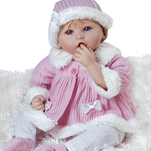 Eager to spread her wings and make snow angels, this oh-so-cute winter baby is ready to snuggle with you! All bundled up in a pink Winter Wonderland themed ensemble, Penguin Baby is all ready to welcome winter and a burst of cold weather. No matter if she's cozied up with you indoors or outside in her stroller with falling snowflakes, she is stylishly suited in a darling pink ribbed knit coat dress accented by pretty pink flower shaped buttons and fluffy white faux fur trim collar, cuffs, hem and matching winter hat. Her outerwear look is beautifully layered over a penguin onesie, cozy blue polka dot and pink flower fair isle patterned leggings and pink snow booties.