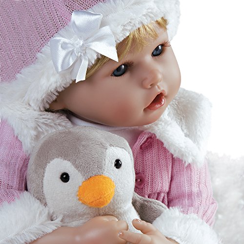 Penguin Baby is a realistic baby doll that has the lifelike features similar to reborn babies. She is masterfully sculpted and handcrafted in Silicone-like FlexTouchTM Vinyl, an innovative material with silicone base creating a texture that is as "soft as a baby's bottom" providing a delicate and realistic skin tone.