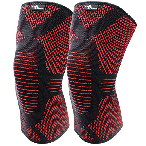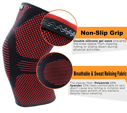 Key Features Optimal compression : grade to improve muscular endurance, protect the knees and promotes faster muscular recovery. Pain relief and moderate support : in minor or incipient knee illnesses like: runners and jumpers' knee, arthritis, tendonitis, however this is NOT a medical device and will not treat the above knee injuries. DOUBLE silicone anti-slip wave: that provides the best grip so you won't have to readjust it during gym time, squats, weightlifting, yoga dance, marathons, fitness or gymnastics. It doesn't roll, slide or slip down. Ultra Lightweight: professional grade material (nylon lycra blend). Designed for all day comfort, flexibility and ultra-durability. The Right Fit: use the sizing guidelines to find the correct fit for your knees. Measure 4" above knee circumference and choose between high compression and moderate compression.