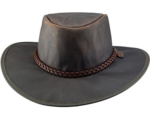 Binding : Apparel Product Description Crusher Outback Leather Hat. It is a outback design hat and it is super lightweight. It survives packing like no hat we have ever made. Fold it up, beat it up, stuff it in a pocket, head into a storm. This hat bounces back and looks great no matter the abuse. 0