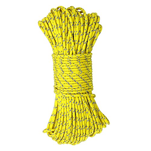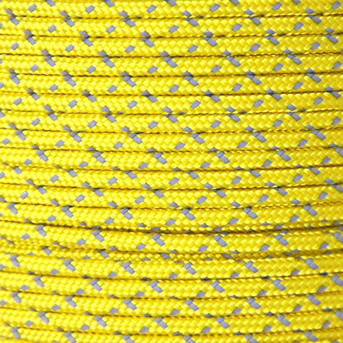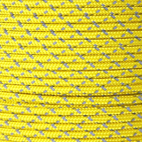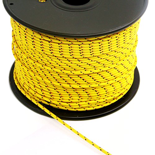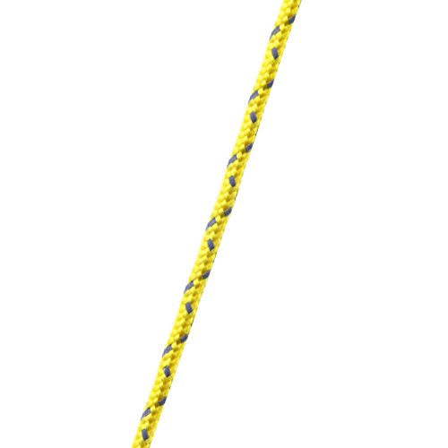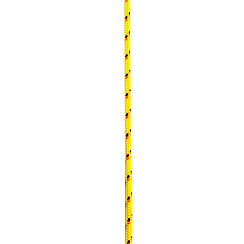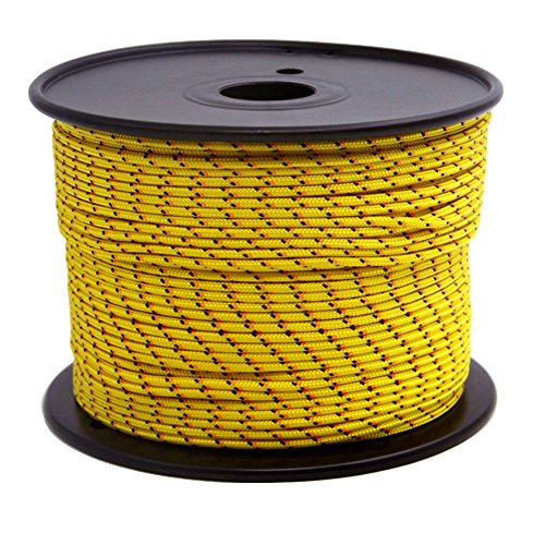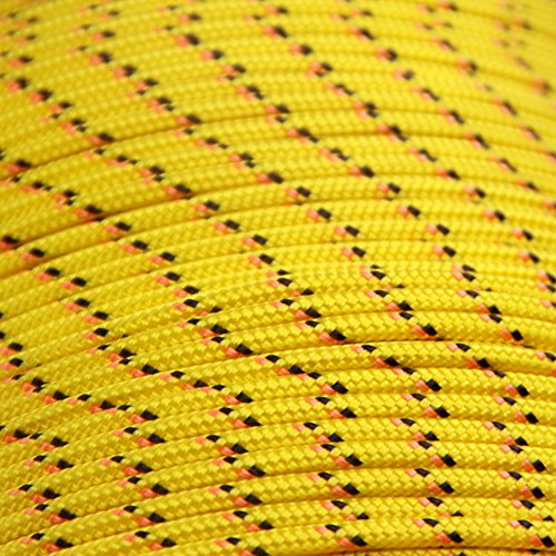 GM CLIMBING 500lb 3mm (1/8inch) Accessory Cord Specification Diameter: 1/8inch / 3mm Material: Polyester Sheath, Nylon Core Color: Yellow with BlackRed Flecks Net Weight: 6.5Oz per 100ft / 6g per meter Breaking strength: 500lb / 225kg Elongation at 10% MBS: 3% Resist the brutal outdoor environment! In sun exposure, heavy rain and strong wind outdoor environment, only survive tough gears. Double braid construction means that the cord gets 2 braided parts: the core and the protective sheath which is firmly braided outside the core. Nylon Core is selected for higher tensile strength. Polyester "jacket" is resistant to UV, abrasion, and most chemicals. It absorbs almost no water which avoids rope gaining weight. It stretches less, which saves energy in functional system. 0
