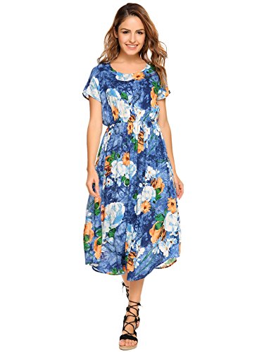 FEATURES: Midi dress, O-neck, short sleeve, casual dresses, party dress, beach dress, loose fit, floral printed dress, summer dress, pockets dress
