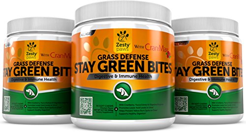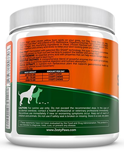 -. Feature : GUARD YOUR LAWN & HELP YOUR PET - Zesty Paws Stay Green Bites are lawn protector chewables that get to the source of grass burn caused by dog urine to help your lawn go from burned to beautiful, while also providing digestive and bowel support. / ENHANCED WITH Cran-Max® - This formula contains 50mg of Cran-Max®, a concentrate made from cranberries using patented Bio-Shield® technology, and clinically proven to flush out bad bacteria to support the bladder and urinary tract. / GRASS & GARDEN SAVER FORMULA - Each soft chew contains 250mg of DL-Methionine, which is an essential amino acid that contains special properties that may help to reduce the nitrogen levels in your dog's pee to put an end to lawn burn. / ENZYME SUPPORT FOR DIGESTIVE RELIEF - Each treat contains 150mg of a six-strain blend of Digestive Enzymes, which pairs with Yucca Extract to support digestion, nutrient absorption, and bowel movement to reduce diarrhea or constipation. / URINARY, DIGESTIVE & IMMUNE CARE - These tasty bites may also support UT and digestive health for dogs with UTI, gas, bloating, kidney, or bladder troubles, plus boost immune system function with the help of Cranberry's Vitamin C antioxidant.
