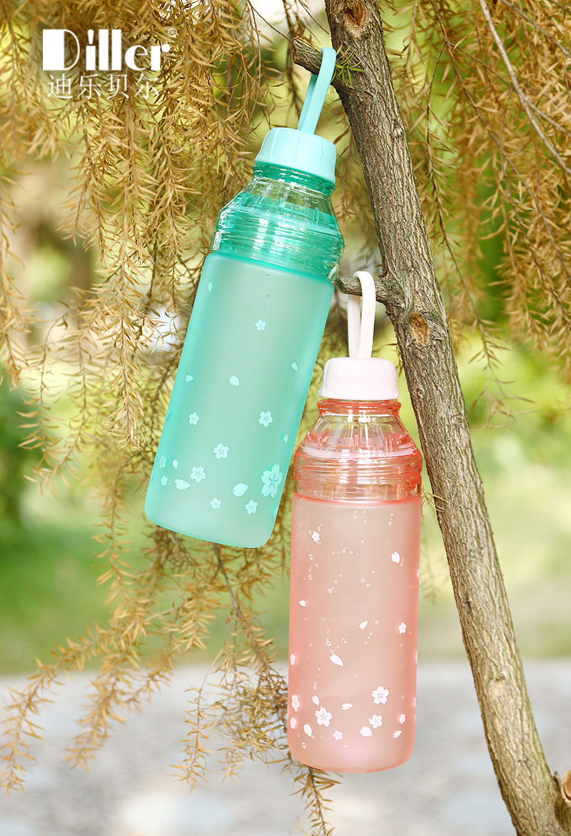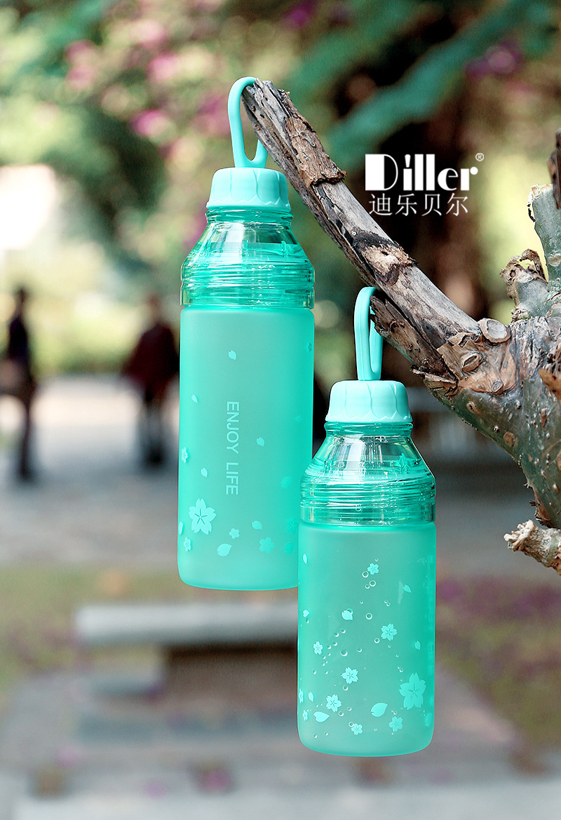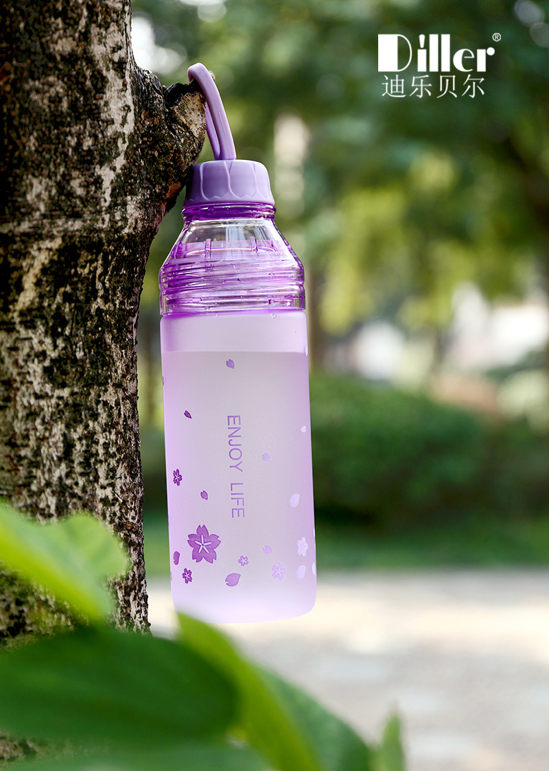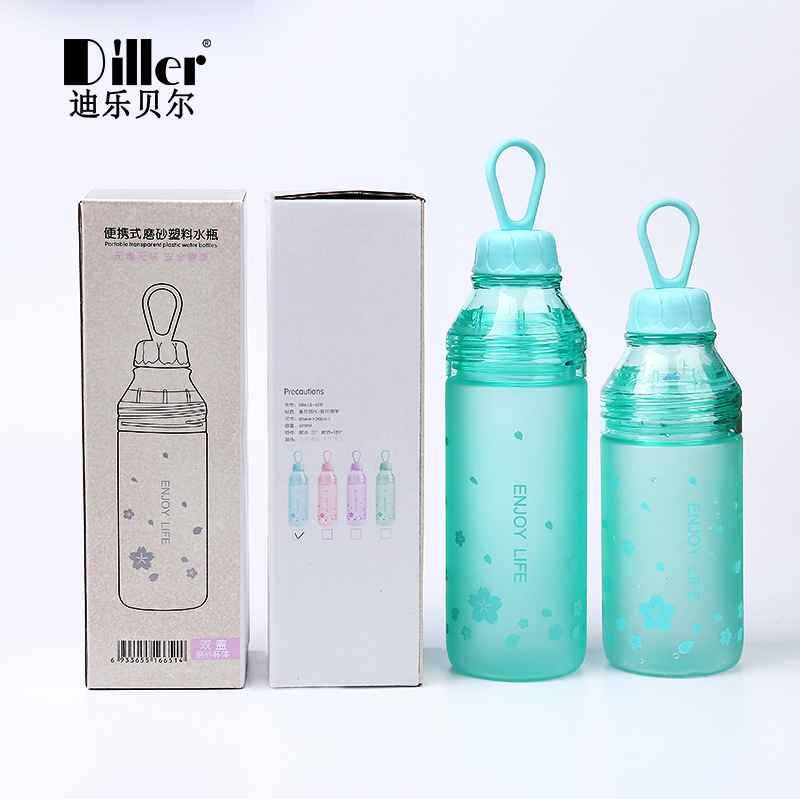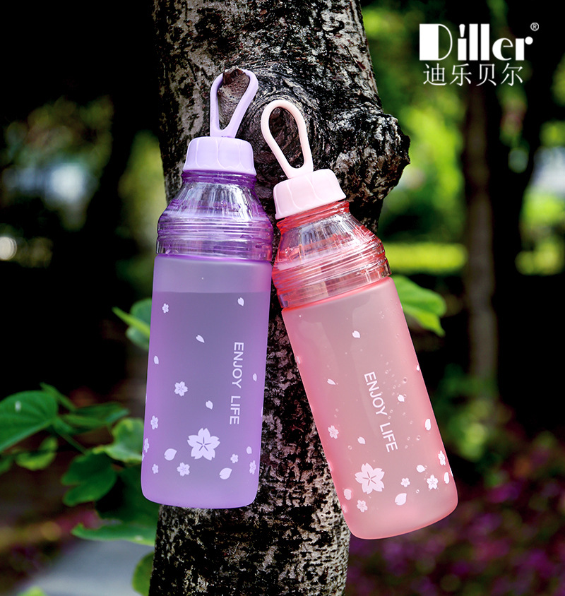 樱花磨砂塑料杯学生户外运动水壶创意便携双盖水瓶随手杯