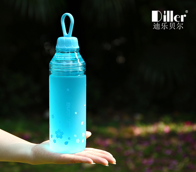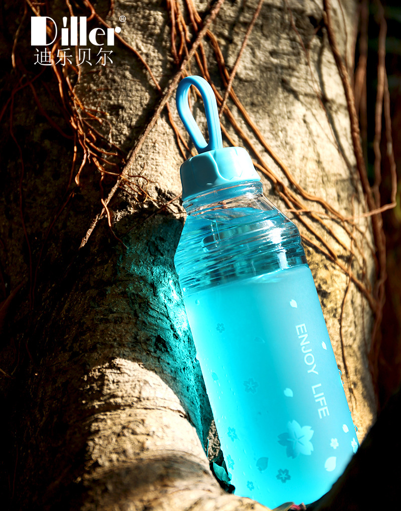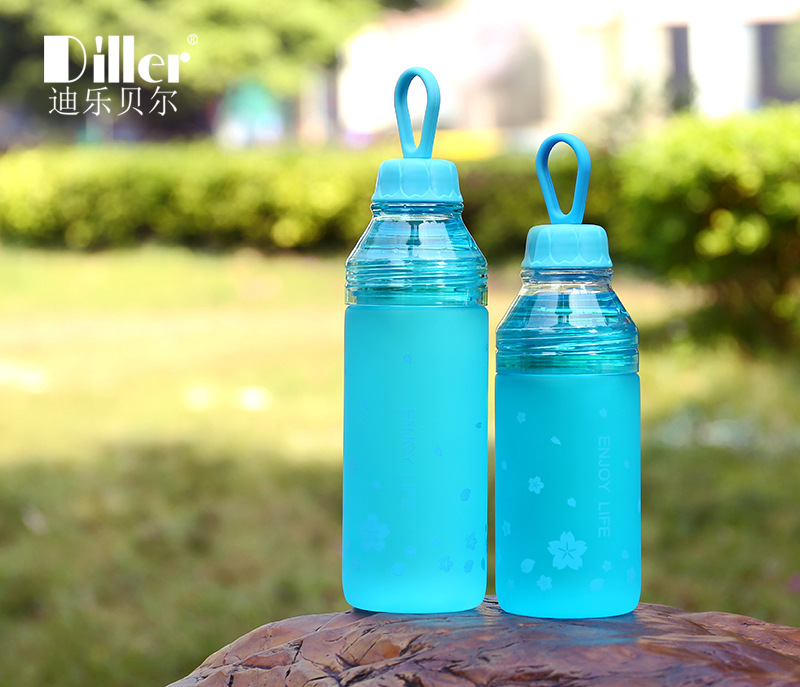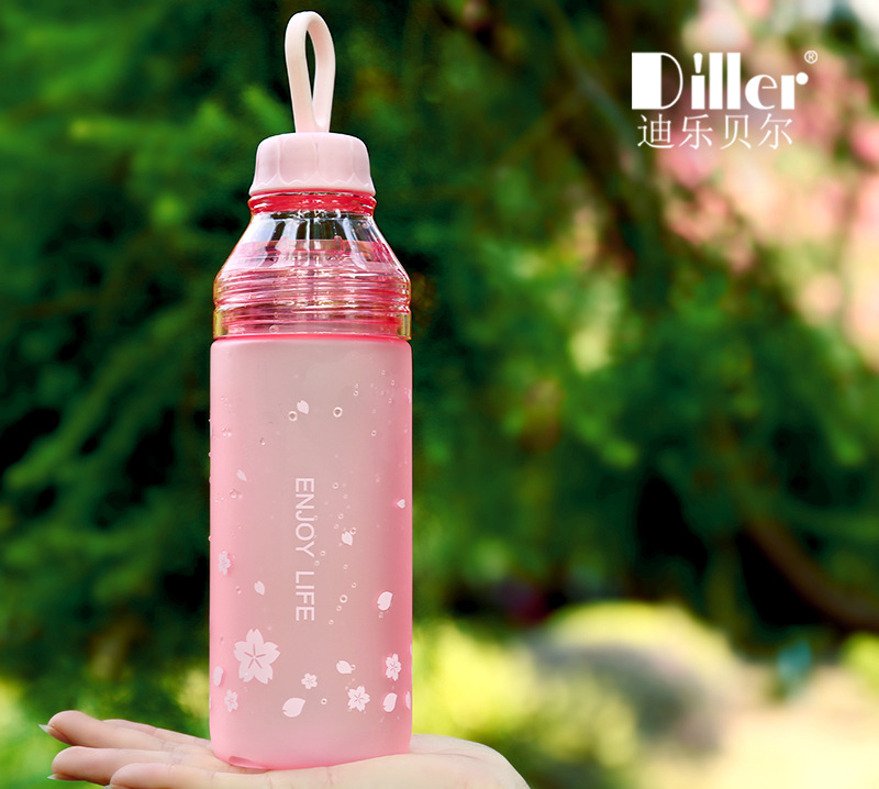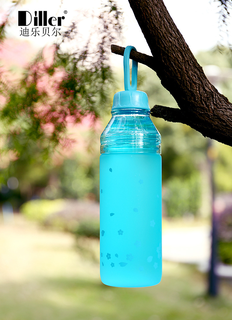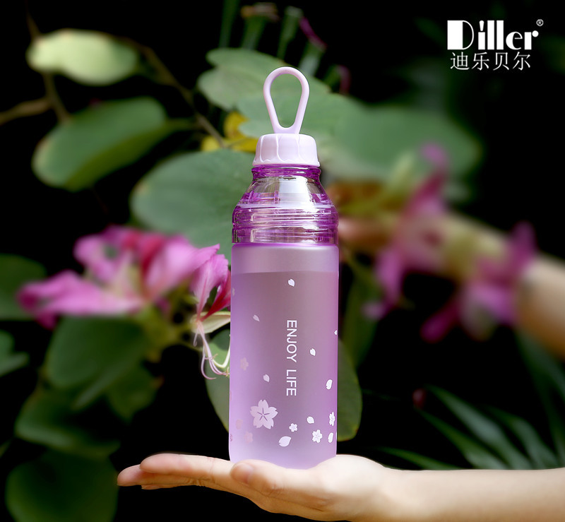 樱花磨砂塑料杯学生户外运动水壶创意便携双盖水瓶随手杯
