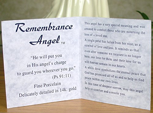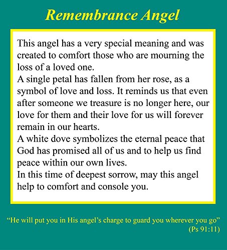 MESSAGE: This angel has a very special meaning and was created to comfort those who are mourning the loss of a loved one. A single petal has fallen from her rose, as a symbol of love and loss. It reminds us that even after someone we treasure is no longer here, our love for them and their love for us will forever remain in our hearts. A white dove symbolizes the eternal peace that God has promised all of us and to help us find peace within our own lives. In this time of deepest sorrow, may...