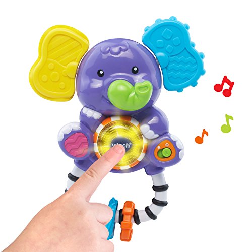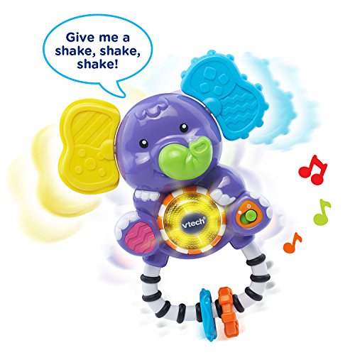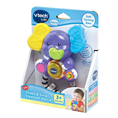 VTech baby rattles are great baby toys and baby gifts. Your child will love rattling the Shake and Sing Elephant Rattle by VTech. Press the adorable elephant's light-up button and it will play melodies, songs and fun phrases. Little ones will also build fine motor skills by turning the elephant's trunk and his soft, textured ears, which are perfect for teething. When they grasp the black and white textured handle and shake the rattle, they will activate the motion sensor and be rewarded with a variety of silly sounds. Shake and play with the elephant! The baby rattle is intended for babies ages 3 months to 3 years. The interactive rattle requires 1 AAA battery (battery included for demo purposes only; new battery recommended for regular use).Feature