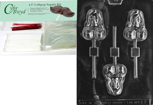 Cybrtrayd 45StK50R-X002 Dolly Lolly Adult Chocolate Candy Mold with Lollipop Supply Bundle, Includes 50 Lollipop Sticks, 50 Cello Bags and 50 Red Twist Ties