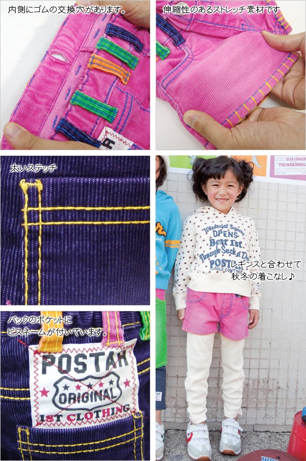 コメント:コーデュロイのカラフルなパンツです。ベルトループやポケットの色にも凝っていておしゃれですね。裾部分のステッチもかわいいです。
