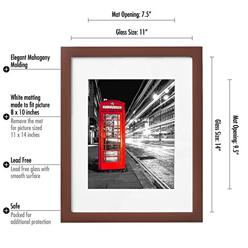 -. Binding : Misc. -. Brand : Americanflat -. Color : Black -. EAN : 0758381223852 -. Feature : ELEGANT EUROPEAN DESIGN: 11x14 inch Mahogony Picture Frame Made to Display Pictures 8x10-inch with Mat or 11x14-inch Without Mat. / HIGHEST QUALITY MATERIAL: Ideal for photos sized 11x14-Inches without the Mat and 8x10-Inches with the Mat; perfect for almost all shadow-box projects. Comes with easy opening tabs at the back to easily load your photos. / ATTRACTIVE LOOK: White mat keeps photos and artwork looking great for years. Turn your posed portraits, artful prints, and everyday shots into a spectacular display. The actual mat opening is 7.5x9.5 inches. It is designed to hold a 8x10 inch photo in place. We recommend taping the photo to the back of the mat. / PERFECT FOR HOME OR OFFICE: Mahagony color with sturdy glass front. Comes with easy to install hanging hardware. / PROTECTIVE PACKAGING: Americanflat developed exclusive proprietary packaging that helps ensure safe delivery of fragile and glass items. Order with confidence, click and add to cart today. -. IsAdultProduct : 0 -. IsAutographed : 0 -. Label : Americanflat -. Manufacturer : Americanflat -. Model : MW1114MAH810 -. MPN : MW1114MAH810 -. PackageQuantity : 1 -. PartNumber : MW1114MAH810 -. ProductGroup : Home -. ProductTypeName : HOME -. Publisher : Americanflat -. Size : 11x14 inch -. Studio : Americanflat -. Title : 11x14 Mahogany Picture Frames - Made to Display Pictures 8x10 with Mat or 11x14 Without Mat - Wide Molding - Wall Mounting Material Included -. UPC : 758381223852