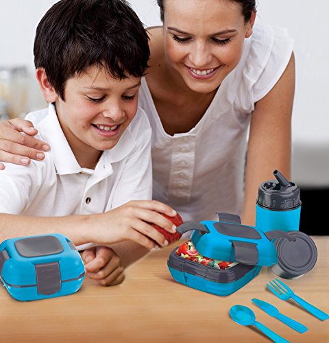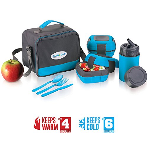 Lunch Box Bag Set for Adults and Kids ~ Pinnacle Insulated Leakproof Thermo Lunch KitLunch BagThermo bottle2 Lunch ContainerMatching Cutlery ~Blue