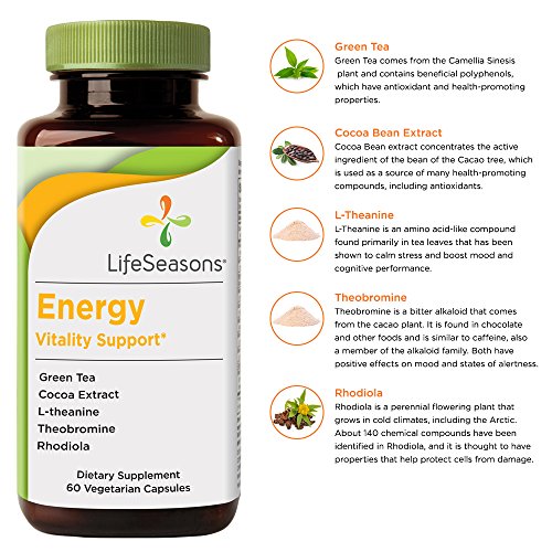 -. Binding : Health and Beauty -. Brand : Life Seasons -. EAN : 0853760002230 -. Feature : NATURAL ENERGY SUPPLEMENT: Energy is a vitality tonic that helps overcome tiredness and fatigue without unwanted side effects. It helps improve mental and physical energy and performance, is mood enhancing, and helps fight the damaging effects of free radicals. / GREAT ALTERNATIVE TO ENERGY DRINKS: People who take Energy usually feel it within 20-30 minutes. It gives a nice and even elevation in their overall energy level, without the jitters from harsh energy drinks. This product is best taken on an as-needed basis. / CLINICALLY-TESTED INGREDIENTS: Our Energy formula is designed to help increase energy by using ingredients like Rhodiola, Theobromine, Green Tea and L-Theanine that have positive effects on states of alertness. / HELP OVERCOME TIREDNESS: Take two capsules when you're feeling like you need an energy boost. For added benefits, consider taking one minute to sit down, take three deep belly breaths, smile, and imagine feeling a soft vibration spreading throughout your body. / NATURE WORKS. SCIENCE PROVES IT: LifeSeasons creates supplements to support your body's health. Our expertise is at the heart of every formula that we create as we balance the wisdom of nature and the progress of science through natural health supplements. -. IsAdultProduct : 0 -. Label : LifeSeasons -. Manufacturer : LifeSeasons -. Model : VBPUKPPAZIN1164 -. MPN : 223 -. PackageQuantity : 1 -. PartNumber : 223 -. ProductGroup : Health and Beauty -. ProductTypeName : HEALTH_PERSONAL_CARE -. Publisher : LifeSeasons -. Size : 60 Capsules -. Studio : LifeSeasons -. Title : LifeSeasons Energy Vitality Support - Natural Energy Support Supplement (60 Capsules) -. UPC : 853760002230