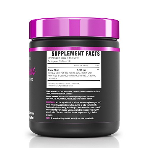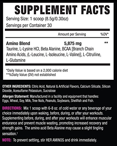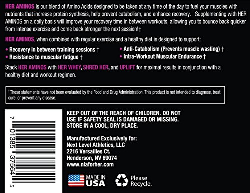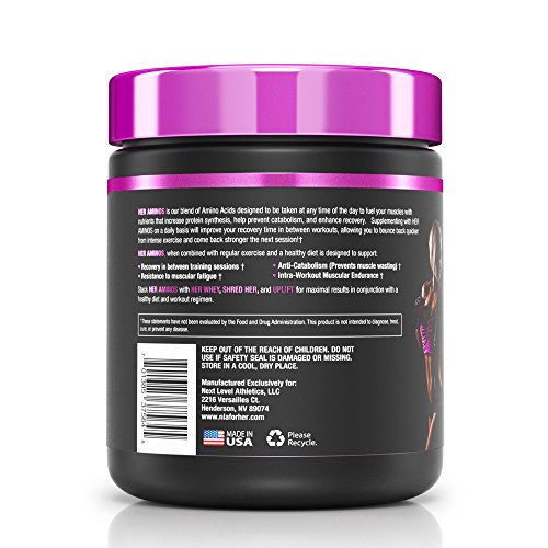 ReleaseDate : 2016-06-28 Studio : NLA For Her Publisher : NLA For Her Binding : Health and Beauty Product Description Her Aminos is a blend of amino acids designed to be taken at any time of the day to fuel your muscles with nutrients that increase protein synthesis, helps prevent catabolism and enhance recovery.* Supplementing with Her Aminos on a daily basis will support recovery between workouts, allowing you to bounce back quicker from intense exercise and come back stronger at your next session!* Increases Endurance, Builds Lean Muscle, Enhances Recovery! Immediate absorption provides immediate effects: Unlike proteins and other macronutrients, Her Aminos can be absorbed into your muscles within a matter of minutes after ingestion. Almost immediately after taking your dose of Her Aminos, you force your body into an instant catabolic (muscle breakdown) halt, increasing protein synthesis (muscle growth) and getting energy from the aminos and nutrients instead of breaking down your muscles.* We recommend that you take Her Aminos before, during, and after each workout session. When you have a constant supply of Her Aminos in your system during this peri-workout period, you are supporting minimal muscular breakdown during intense exercise and increasing recovery. You will immediately notice extra strength and endurance during your workouts, rapid recovery and less muscular soreness after your workouts. Supplementing with Her Aminos on a regular basis will help take your performance, physique, and training to a new level. All NLA for Her supplements are created in GMP and NSF certified manufacturing facilities. We place a high priority on our quality control procedures to ensure you are getting the highest quality supplements. The NSF maintains laboratories in North America, South America. 0
