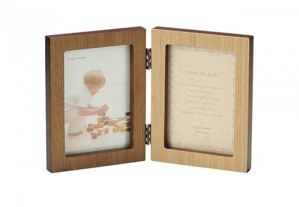 | 赤ちゃんの成長を温かく包み込む木目のフォトフレーム。 |