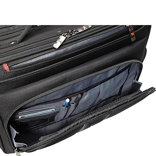 -. Feature : Accommodates up to 17 laptops / Divided compartment for legal size folders / Organizer on the front / Retractable push-button locking handle / Wheelcorner protectors and rear kick plate