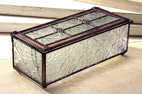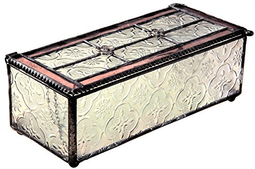 -. Feature : Tiffany styled jewelry box with clear glass with embossed vintage texture and a pink rose trim / Decorative beaded edge, filigree flower buds on the top and ball feet on the bottom / This glass box is perfect to display your jewelry, trinkets and keepsakes / Handcrafted stained glass jewely box made with lead free solder to protect you and the environment / Designed and Manufactured by J Devlin Glass Art 3"x7"x2 1/4"