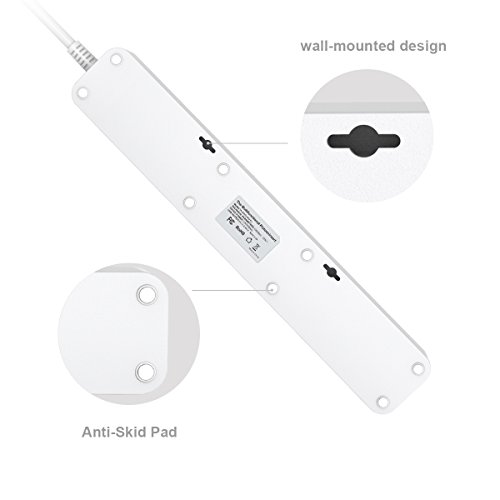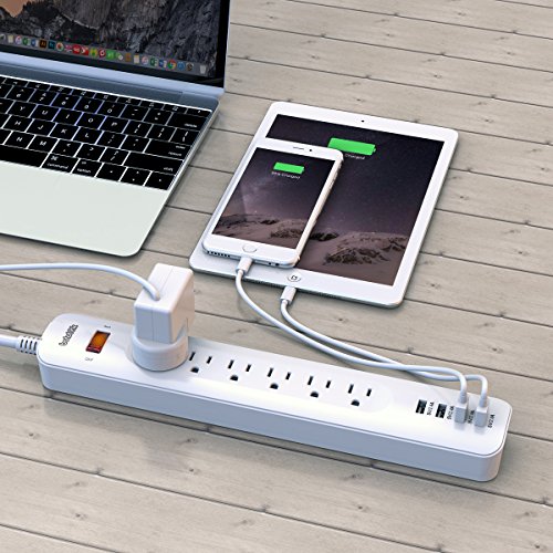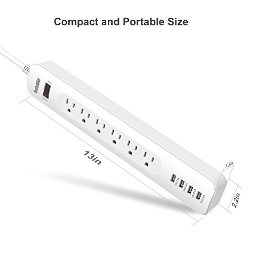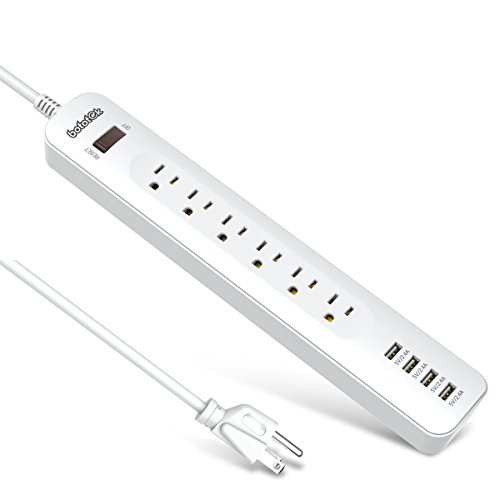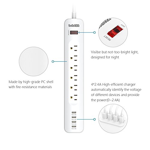 Bototek 6-outlet power strip with 4 Smart 5V/2.4A USB Charging ports and 6ft Cord, Built-in 1250W/10A 500J Surge protector, for smart phones & tablets, White