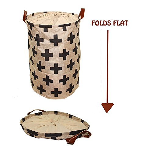 FOLDS THIN AND STACKS FOR EASY STORAGE Foldable laundry hamper, with 2 Brown Leather handles, easy to carry for travel or laundromat. Great for storing stuffed animals and toys