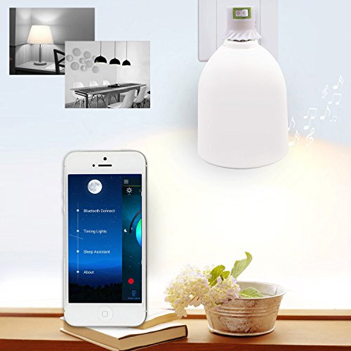 E27/E26 LAMP BASE: Easy to operate, just plug in and connect via Bluetooth. Light brightness, Bluetooth on-off, music play & stop and music volume are adjustable controlled by cellphone APP