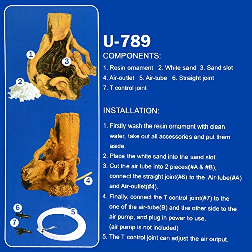 Studio : Saim Publisher : Saim Binding : Misc. Product Description non-toxic polyresin tree root ornament is perfect for adding a little character to your aquarium. Installation: 1.Firstly wash the resin ornament with clean water, take out all accessories and put them aside. 2.Place the white sand into the sand slot 3.Cut the tube into 2 pieces(#A #B), connect the straight joint (#6)to the Air- tube (#A) and Air-outlet(#4) 4.Finally, connect the T control join (#7)to the one of the air-tube(B) and the other side to the air pump, and plug in power to use.( air pump is not included) 5.The T control joint can adjust the air output. Features: Color: As picture shown Material: Resin Dimension: 7.5 x 7.1inches(H*W)