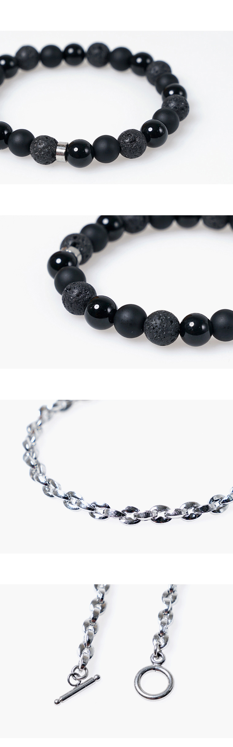 8mm 두께의 무광오닉스와 화산석을 믹스해 제작된 원석팔찌와 유니크한 조직의 써지컬스틸 체인을 사용해 제작된 체인팔찌로 이루어진 팔찌세트입니다.