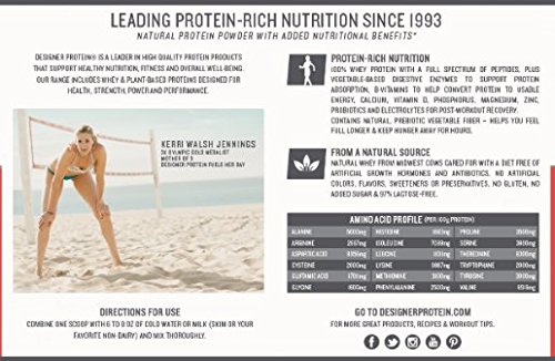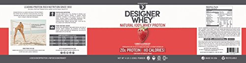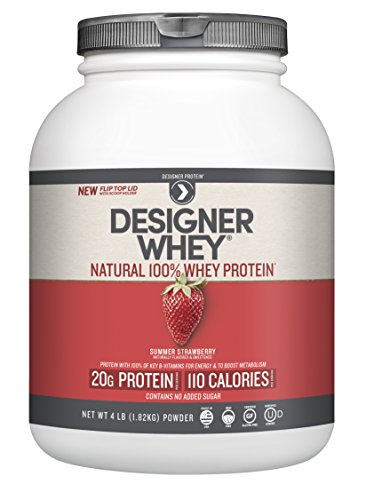 ReleaseDate : 2008-07-08 Studio : Designer Whey Publisher : Designer Whey Binding : Grocery Product Description Designer Whey led the innovation of the first commercially available whey protein powder in 1993.? Two decades later, it more than meets the gold standard among those who recognize the superior protein benefits of 100% whey.? Trusted by Olympic champions, Designer Whey is Kerri Walsh Jennings’ favorite protein powder.? 20g of premium natural whey protein with added amino acids including L-glutamine, L-Leucine, Taurine, L-phenylaline, plus, vitamins, minerals, probiotics, and electrolytes for post workout recovery.? Designer Whey contains vegetable-based digestive enzymes to support protein absorption and 100% Daily Value of important B-vitamins to convert protein to usable energy to help boost metabolism.? Enjoy the benefits of Designer Whey in a range of flavors including French Vanilla, Gourmet Chocolate, Summer Strawberry, Vanilla Almond, Double Chocolate, Vanilla Praline and Purely Unflavored. 0