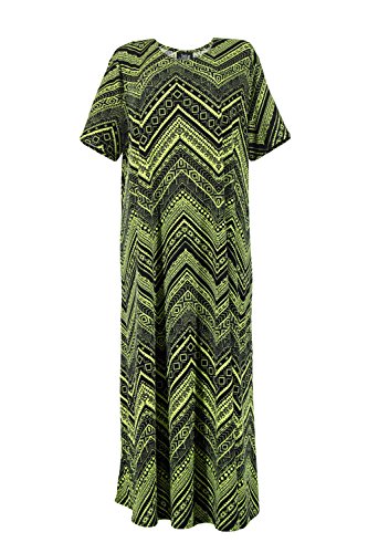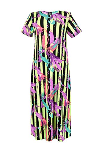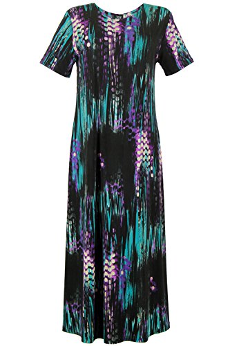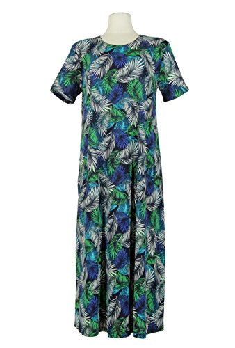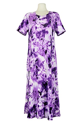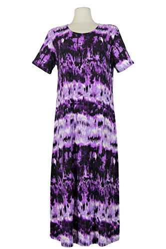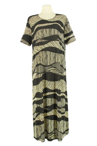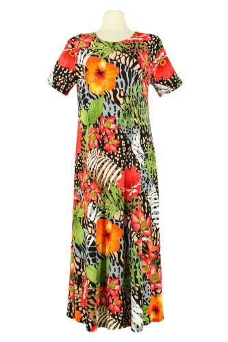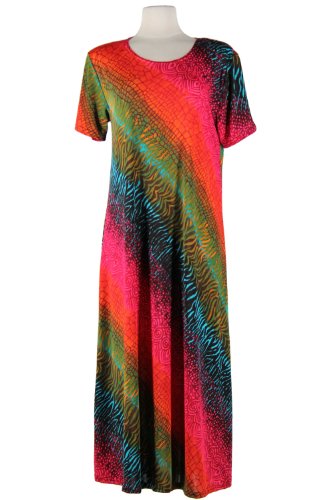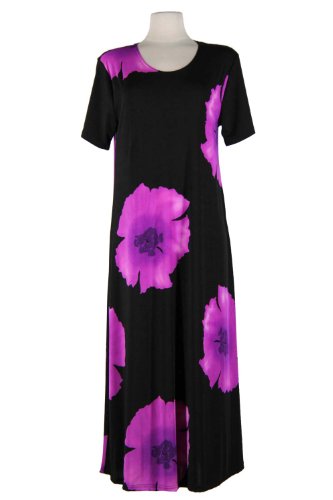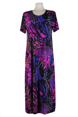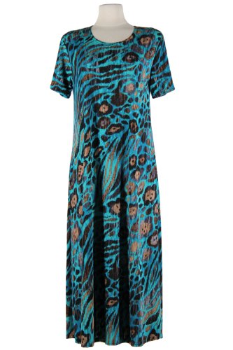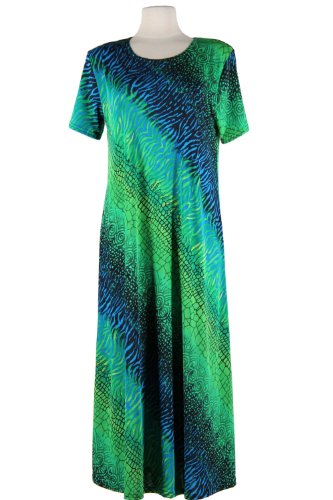90% Polyester, 10% Spandex. Short sleeve and soft round-neckline long dress with a variety of prints available and 49 inches in length. Hand or machine wash in cold water.