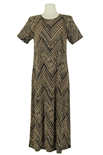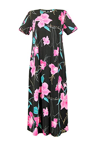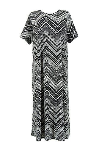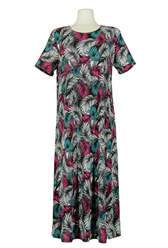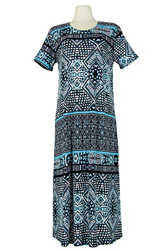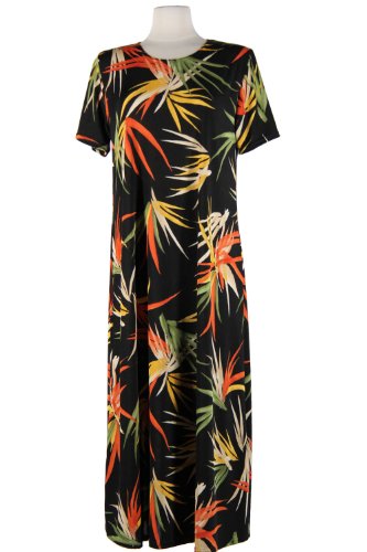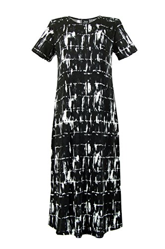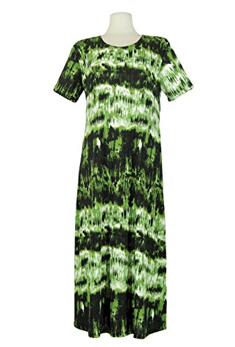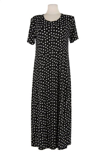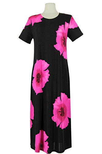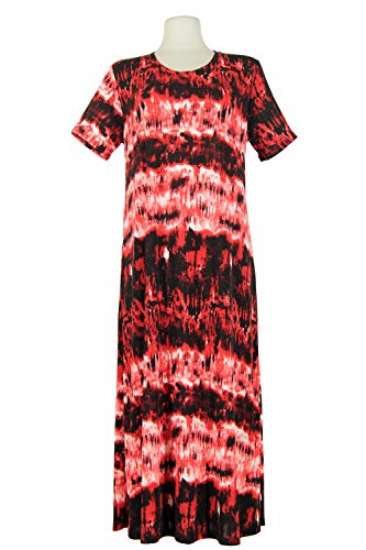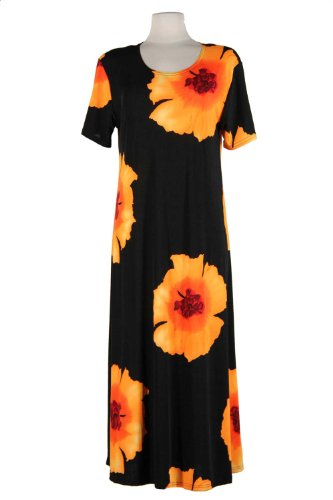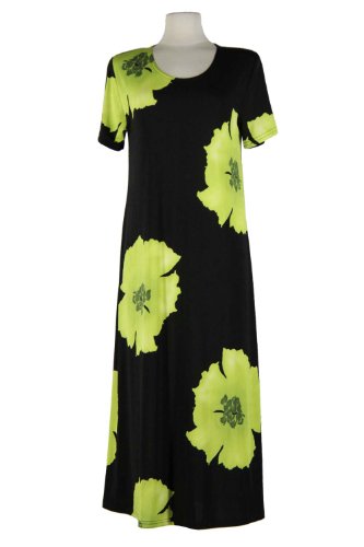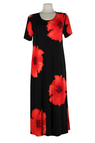 90% Polyester, 10% Spandex. Short sleeve and soft round-neckline long dress with a variety of prints available and 49 inches in length. Hand or machine wash in cold water. Made in USA Brand : Jostar Item model num : 702BN-SP-W125-BLK-XL