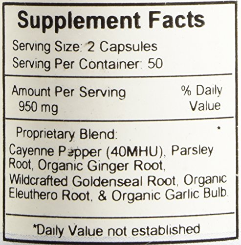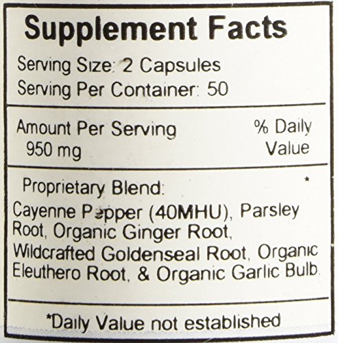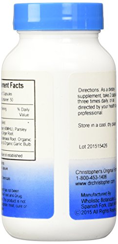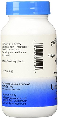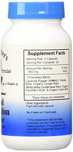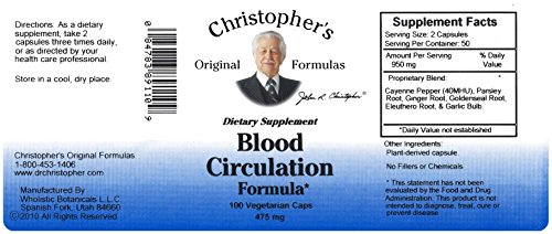 Studio : Dr. Christopher Publisher : Dr. Christopher Binding : Health and Beauty Product Description Blood Circulation Formula by Dr. Christopher 100 VegCap Blood Circulation Formula Cayenne Ginger Golden Seal Ginseng Parsley and Garlic. This group of herbs feed cayenne (a stimulant) and ginger (stimulant) into the circulatory system where the cayenne works from the bloodstream to the heart and arteries and out into the veins. The other herbs in this formula assist these two herbs and work together to equalize the blood pressure (whether high or low) to bring it to a good systolic over the diastolic reading. This formula is given to assist blood purifying teas to work more efficiently and to also aid the clearing up of allergies etc. Available in vegicaps and extract. 0