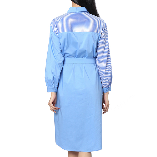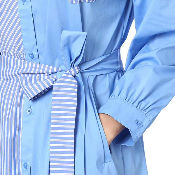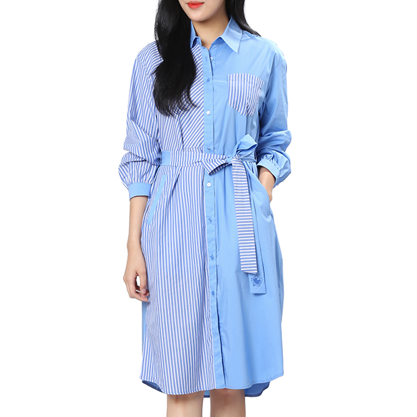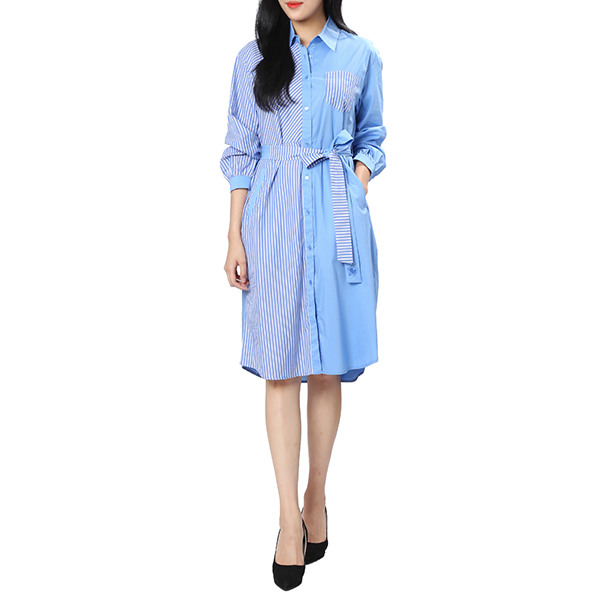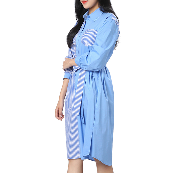 블루 색상의 스트라이프 배색 디자인으로 유니크한 매력을 담은 셔츠 원피스 입니다. 벨티드 장식으로 여성스럽고 캐주얼한 핏 라인을 연출할 수 있습니다.