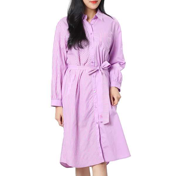 핑크 색상의 스트라이프 배색 디자인으로 유니크한 매력을 담은 셔츠 원피스 입니다. 벨티드 장식으로 여성스럽고 캐주얼한 핏 라인을 연출할 수 있습니다.