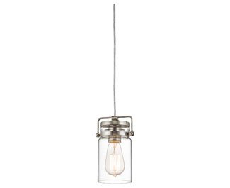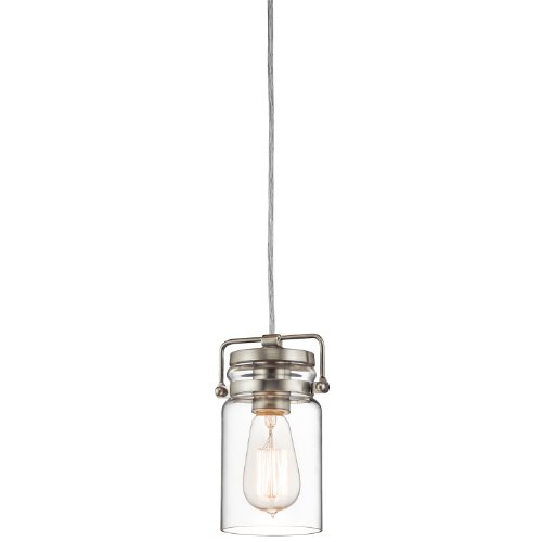 Kichler Lighting 42878NI Brinley 1LT Mini-Pendant brings a new level of charm to your home with the simply formed pendant in a sleek Brushed Nickel finish encased by a clear glass shade reminiscent of a wide mouth mason jar. The eclectic form of this wonderful piece will update any home and be appreciated for many years to come. The 42878NI is 4.75IN in diameter x 7.75IN high. The 42878NI comes one per package, and requires one (1) 100W medium base incandescent lamp (not included), dimmable using a standard incandescent dimmer. For maximum design impact, you can purchase the Vintage Squirrel Cage Filament Bulbs (4071CLR) separately from Kichler Lighting, as shown in the image. For a more energy efficient alternative, use medium base CFL's or LED's, and let your own green statement be heard, as well as your exquisite good taste. Since 1938, Kichler Lighting has offered a distinctive array of lighting solutions that reflect your individual personality, tastes and plans. Kichler brings you an unparalleled variety of exciting style families, unique finishes, fresh colors and unequaled quality. Whether it's casual, contemporary, transitional or traditional, you'll find it with Kichler, lighting that defines your style.Feature