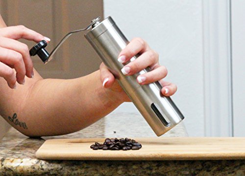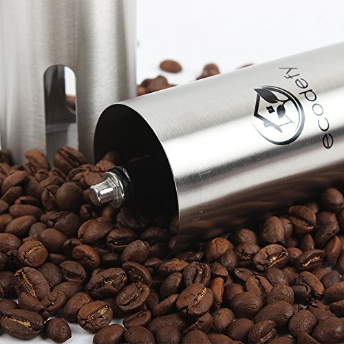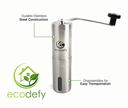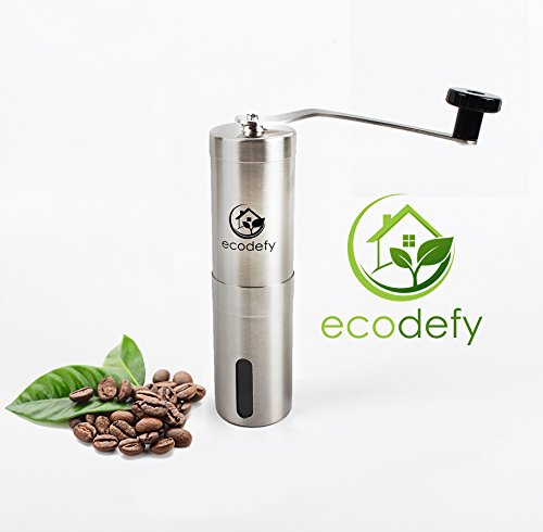 -. Brand : EcoDefy -. Color : Silver -. EAN : 0646341504946 -. Feature : GRINDS SMOOTHLY AND ACCURATELY - Provides a consistently ground coffee bean using an adjustable, ceramic conical burr that enhances flavor far beyond pre ground coffee beans. Our coffee grinder is the simplest thing you can do to transform the taste of your morning cup of coffee. You've never tasted coffee this fresh! / GORGEOUS, BRUSHED STAINLESS STEEL BODY - Sturdy and durable, this manual hand crank coffee mill stands up to serious, everyday use. Don't worry about damaging it when hunting or camping, because not only it is nearly unbreakable - but it's also rust-resistant! / ADJUSTABLE GRINDER FOR UNLIMITED USES - Easy to customize grind size for all different types of coffee based drinks. Bored of regular coffee? Try making espresso! Works great with any french press, Keurig, pour over coffee dripper, and even herb and spice grinding! Also integrates perfectly with the AEROPRESS for the mobile caffeine addict! / EXTREMELY PORTABLE - No batteries or power required! Great for taking on camping or hunting trips, rock climbing, fishing, or wherever your next adventure takes you. Disassembles easily for air travel as well, never leave for another business trip or vacation without it! / What our customers say! - "With this grinder coming in at half the price of a comparable Hario, it's a no brainer." "I am overall very happy with it and I will be using it a lot!" "I LOVE this thing!" "Great grinder worked awesome the first time I used it" "Overall I would definitely purchase this product again!" "does the job EXCEPTIONALLY WELL" "This things a keeper, it's easy to set up and use and clean!" -. Label : EcoDefy -. Manufacturer : EcoDefy -. ProductGroup : Kitchen -. ProductTypeName : KITCHEN -. Publisher : EcoDefy -. Studio : EcoDefy -. Title : Premium Stainless Steel Manual Coffee Grinder Mill by EcoDefy - French Press, Keurig, and Aeropress Compatible, Adjustable Ceramic Burr - Portable and Durable Enough for Camping -. UPC : 646341504946