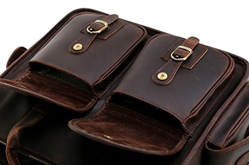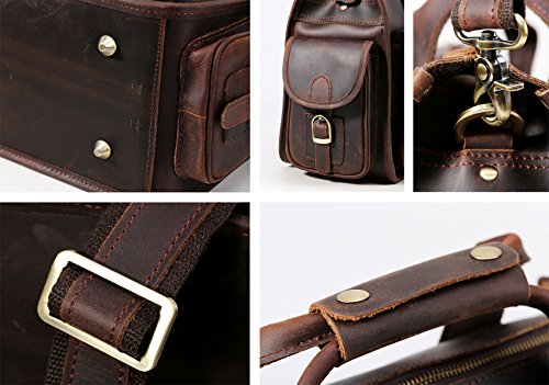 -. Feature : Top layer crazy horse genuine cow leather. Retro brass color stainless steel hardware. Retro and vintage design. / Roomy main compartment can hold your 13" laptop, also iPad, chargers, documents, and etc. Inside there are 6 card slots, 2 license slots, 1 laptop section, 2 wallet sections,2 pen slots, and 1 concealed zipper pocket. The 4 outside magnetic snap pockets are handy for tiny essentials such as memo or receipts. It would be much safe if you keep things in back zipped pocket. / Come with adjustable strap. With padding on strap, you have no need to worry about pressure on shoulder. Smooth zipper of main closure will make you never regret for the deal. Four feet help bag stand easily. / Casual style. Perfect everyday bag that can be taken to anywhere-- traveling, campus life, or even taken as gym sports bag. It will show your personal charm and taste perfectly. / Size: (L) 15.7 x (H) 11.8x (W) 6.3 inches. The weight is about 3.75 pounds. Shoulder strap can be adjusted at the range between 44.5~57.5 inches. When tied with bag, it will drop 19.3~25.2 inches. Please allow the error of half inch in actual use.