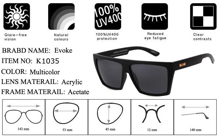 Model Number: 11SUN-EV1035-B Function: UV400 Protection Color: 11 Colors Package: Sunglasses x1; Cleaning Cloth x1; Bag x1; Box x1 is_customized (MOQ): 600pcs customized Name: Evoke