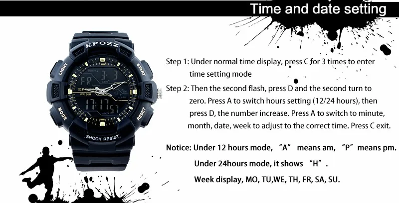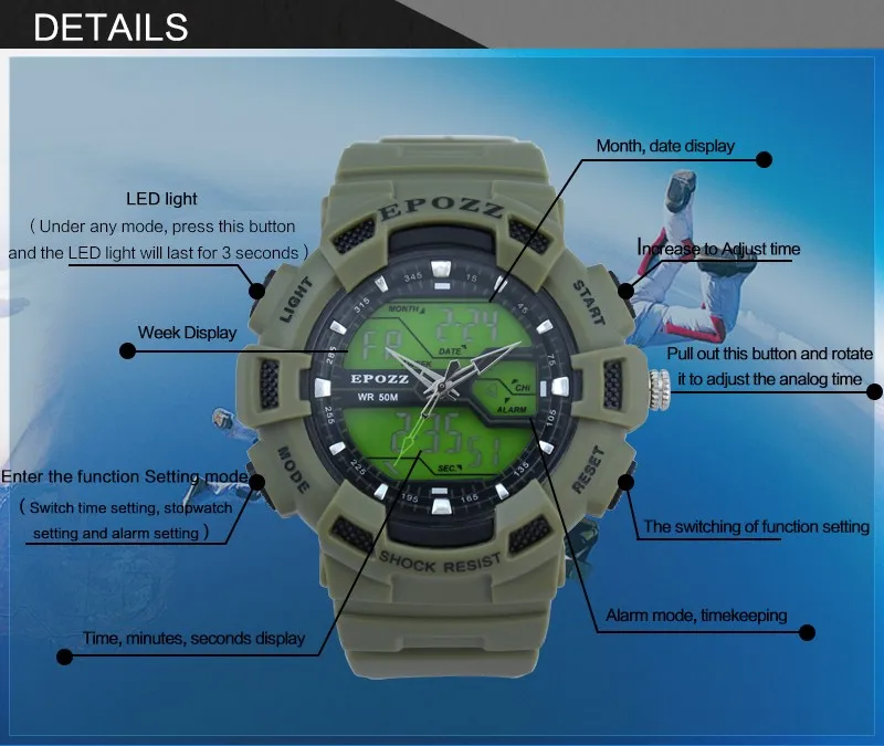 Feature:Alarm,Back Light,Water Resistant,Stop Watch,Swim,Chronograph,Auto Date,Diver