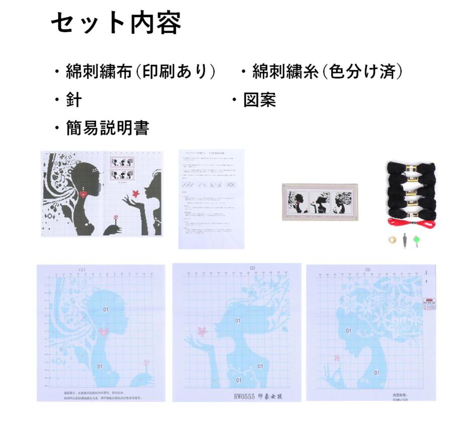 ・刺繍キット モノクロ女性 3枚セット セット内容:刺繍キット×3、刺繍糸、 刺繍針、日本語の簡単なやり方説明書