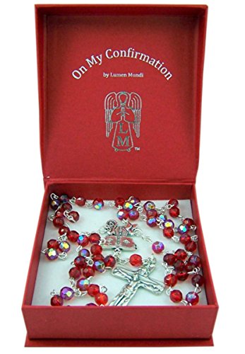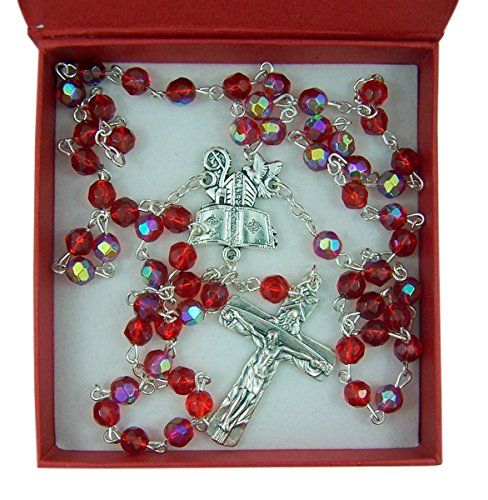 Red Acrylic Bead Confirmation Rosary Necklace with Silver Tone Holy Spirit Centerpiece and Crucifix, 28 Inch