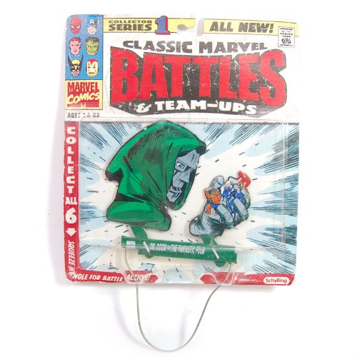 -. Binding : Toy -. Brand : Marvel Comics -. EAN : 0019649218554 -. Feature : Squeeze the handle on these classic tin toy replicas and watch your favorite Marvel super heroes do battle / You get the complete series, all 6 team ups as shown in the photo / Ages 8 and up About 7' Tall with Handle. Figures are about 3" tall / Captain America vs. Ironman, Wolverine vs The Thing, Dr. Doom vs. The Fantastic Four, The Hulk vs. Thor Green Goblin Vs Spiderman , Mr. Fantastic vs. Dr. Doom , -. IsAdultProduct : 0 -. Label : Schyling -. Manufacturer : Schyling -. MPN : MT1 -. PackageQuantity : 1 -. PartNumber : MT1 -. ProductGroup : Toy -. ProductTypeName : TOYS_AND_GAMES -. Publisher : Schyling -. Studio : Schyling -. Title : SPIDER-MAN Classic Marvel BATTLES & TEAM-UPS by Marvel Comics -. UPC : 795571600352