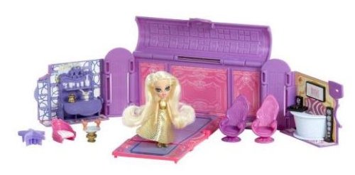 -. Feature : Lil' bratz flaunts real fabric fashions / Dozens of pop-up beauty salon or runway details anchored and free standing inside / Folds neatly inside a stunning handbag / Lock it and take it with you / Bring along this bitty beauty salon and runway hidden inside stylin' hand bags