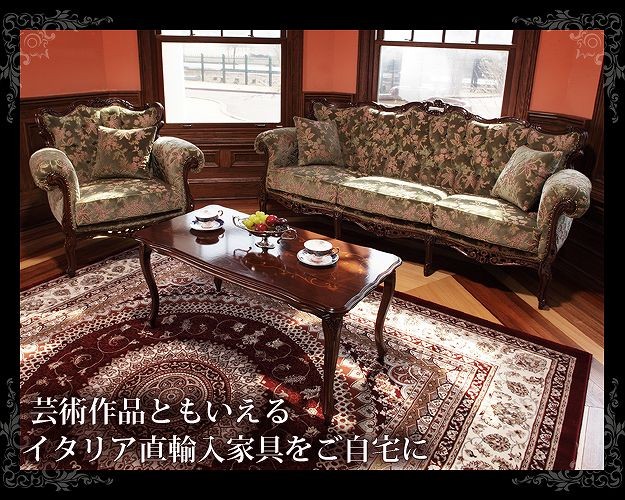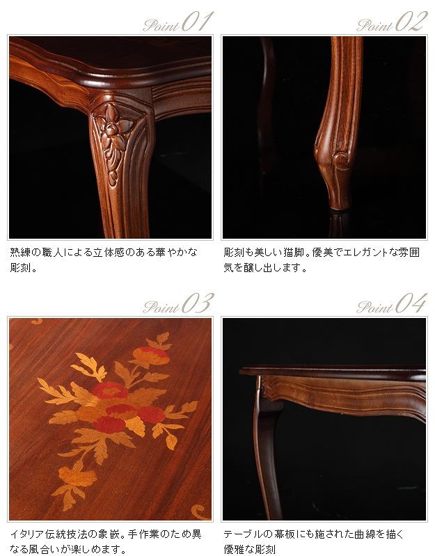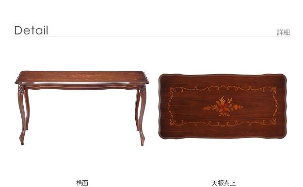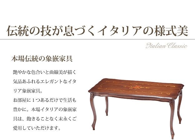 商品について:芸術作品ともいえるイタリア直輸入家具をご自宅に☆ヴェローナクラシックコーヒーテーブル。天板にはイタリア伝統の職人技である美しい象嵌細工が施されています。彫刻が美しい猫脚と滑らかな曲線を描くフォルムがお部屋をエレガントに演出します。