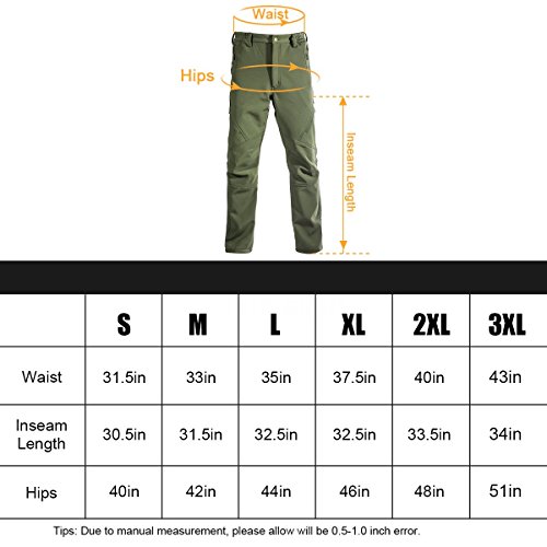 Studio : F S Co., Ltd Publisher : F S Co., Ltd Product Description Outer shell with Water Repellent coating repel rain, snow and cuts the wind. Inner layer polar with Anti-static treatment Fleece Liner brings you warm, soft comfy and high breathable in deep winner weather. Maximum FLEXIBILITY Stretchy ripstop fabric with 6% Spandex. The keen with drapes is ergonomically designed, ensure the flexible, comfortable feeling and more durable. MULTIPLE SECURED ZIPPRED POCKETS 2 zippered thin pockets 2 zippered hand pockets 2 zippered back pockets The soft shell pants with 6 YKK Zipper SECURED Pockets can protect your valuables during the outdoor excursions. Functionality Partial elastic at waist and belt loops that offer a comfortable secure fit and allow you to customize to fit any occasion. YKK Zipper Fly with Metal Closure avoid the embarrassment. FREE SOLDIER Soft shell pants can always keep you warm and cozy in the deep winter. It's ideal for skiing, snowboarding, tactical, military, hunting, climbing, hiking, camping or other winter sports. 0