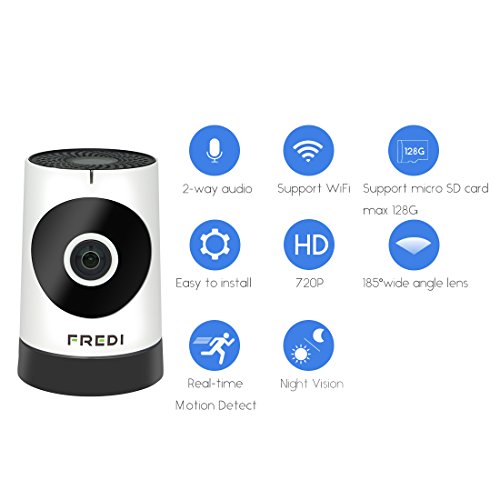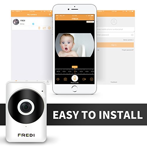 Studio : FREDI Publisher : FREDI Binding : Baby Product Product Description IF YOU HAVE ANY PROBLEMS(like refund,return,replace,etc),PLEASE SEND EMAIL TO eric-se@qq.com on MONDAY-FRIDAY.we will reply you within 24 hours. PLS NOTE:This baby monitor only supports 2.4G WiFi,it can't supports 5G WiFi.Most routers have both 2 frequencies,you simply login to your 2.4GHz network to finish connecting. Smart Home Security for your life. We believe anyone should be able to go anywhere, do anything, and still know what's happening at home. That's why we designed this camera. 1. Records video clips when there any motion events detected. You can also remotely view live video from Smart Phones, iPad? 2. The Motion Sensor of Multi-zone and Adjustable sensitivity. If any motion detected, will Alerts through email or push notifications(iOS and Android) to keep you notified.? 3.Record to a microSD memory card ,so you can easily review the footage from the past. Supports up to 128GB. 4.Utilizing advanced H.264 technology, uses minimal bandwidth and storage requirements with smooth real-time video and audio streaming. 5.185°wide angle viewing allows you monitoring your whole house with clear HD video. Fast and easy setup 1. Simply scan, connected, and See What you want! ? 2. View your camera online Within minutes. With the P2P Server Technology, no complicated port mapping or DDNS settings needed.It's very simple and smoothly. Residential Surveillance Uses: (1)Monitor and secure interiors such as bedrooms,apartments,family rooms, nurseries,garages,guest houses,and more.? (2) While away check in on pets, children and elderly persons.? (3) Camera protects your home by deterring trespassers. Guarantee and Bouns Full 1-Year the FREDI Manufacturer Warranty? Package Including: 1x FREDI Wide angle Camera? 1x USB Charge Cable? 1x Power Adapter? 1x User Manual
