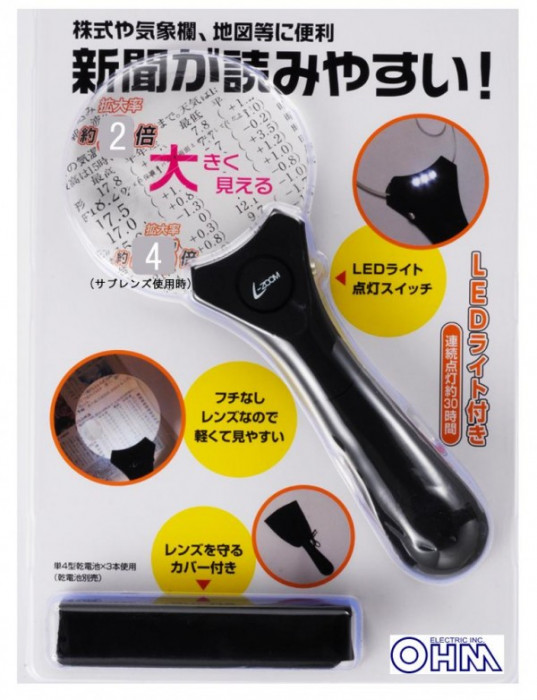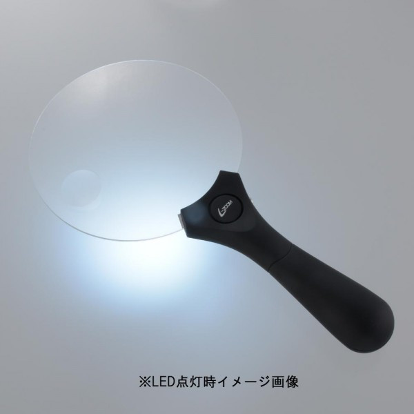 | 仕様 | レンズ寸法:φ137mm(メインレンズ) レンズ倍率:2倍/約4倍(サブレンズ) LED個数:白色LED×3灯(日本製LED使用) 明るさ:17ルーメン 色温度:5700ケルビン 使用電池:単4形乾電池×3本(別売) 連続点灯時間:約30時間(新品・未使用の電池の場合) |