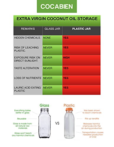 - NO PLASTIC CONTAMINATION: Other brand's plastic jars are prone to leaching leading to contamination. Glass jar preserve nutrients in its purest form. Unrefined, Organic, Cold-Pressed preserves MCTs, silky texture and the pleasant tropical aroma of the coconut. Coconut oil proves a healthy alternative for butter and traditional oils like vegetable, olive, canola and Corn Oils.