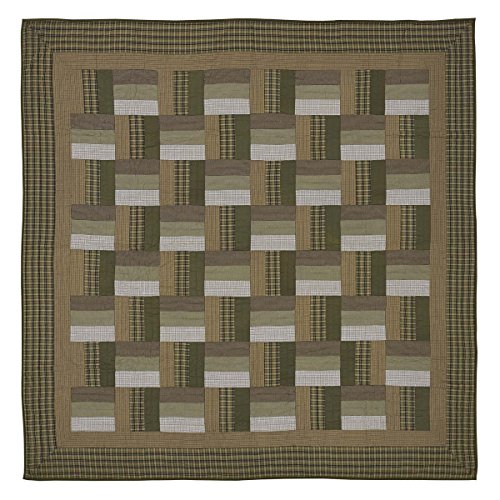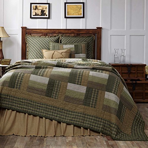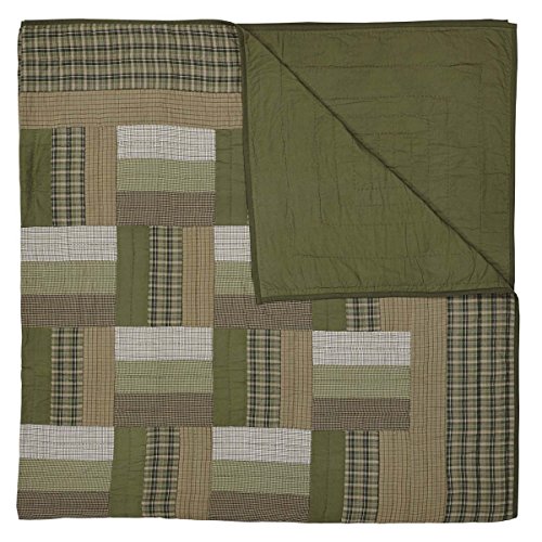 Studio : VHC Brands Publisher : VHC Brands Binding : Kitchen Product Description As beautiful as the Montgomery King Quilt is, a closer look reveals details such as a basket weave and expert hand-quilting. The quilt's striking patchwork blocks in olive green, medium green, tan, and soft white secure its rustic lodge look. Reverses to solid medium green. FEATURES ? Stitch in the ditch hand-quilting ? Featuring patchwork blocks in olive green, medium green, tan, and soft white in a basket weave pattern ? Straight edge with .5" solid olive green binding ? Reverses to solid medium green fabric ? Hand-quilted, Machine pieced ? Patchwork SPECIFICATIONS ? Dimensions: L95"xW105" ? Weight: 7.5 lb ? Material: 100% cotton shell, 100% cotton batting ? Colors: grass green, natural, soft white ? Manufacturer Country: India CARE ? Machine wash separately, front load commercial washer ? Cold water, gentle cycle, no chlorine bleach ? Do not tumble dry ? Do not dry clean without first testing a small portion ? This product may not withstand commercial cleaning chemicals or process due to the fragility of fabrics and handmade nature. SIZES AVAILABLE ? King - Weight: 7.5 lb; Dimensions: L95"xW105" ? Twin - Weight: 4.6 lb; Dimensions: L86"xW68" 0