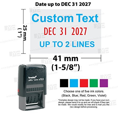 -. Feature : Max. Text Plate size: 1" x 1-5/8" Date Size: No.1, 5/32" / Date Format: Month/Day/Year,The Last Date To DEC 31 2027(12 years) / The stamp can have up to 2 Lines customization text. / Easy To Refill or Replace Ink Pad / Choose two of Five Ink Colors. (Black, Blue, Red, Green, Violet)