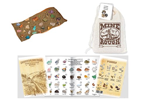 -. Feature : Explore the world of mining and fossil exploration with our gem mining rought. / Each kit contains an artfully crafted canvas bag to hold your gems, a gem and fossil identification guide and a full three pounds of mining rough. / Just place the rough in the screen and sluice by running through water. The sand will dissipate through the screen leaving approximately 6 ounces of genuine gems and minerals. / Purchase additional bags of rough- under separate cover- and try to collect all the gems. Our exploration kits are available in various different versions. We offer two different size roughs each yielding a different amount of gems, a party pack which contains enough rough for a party of 12, and the same in a fossil (instead of gem) version. / Mining screeen sold seperately. The mining rough is made in the USA